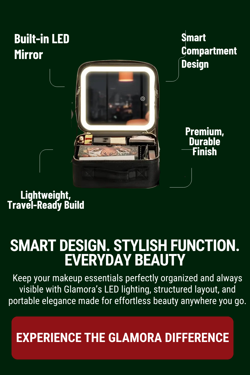 The Glamora Makeup Bag combines professional lighting and smart organization, ensuring flawless makeup anytime, anywhere — whether you’re home, traveling, or on the go.