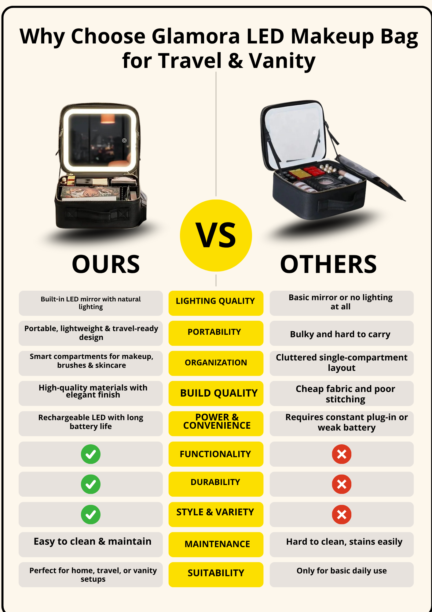 Lightweight yet durable, Glamora fits seamlessly into your travel bag or vanity. It’s your beauty companion for business trips, vacations, or quick touch-ups throughout the day.